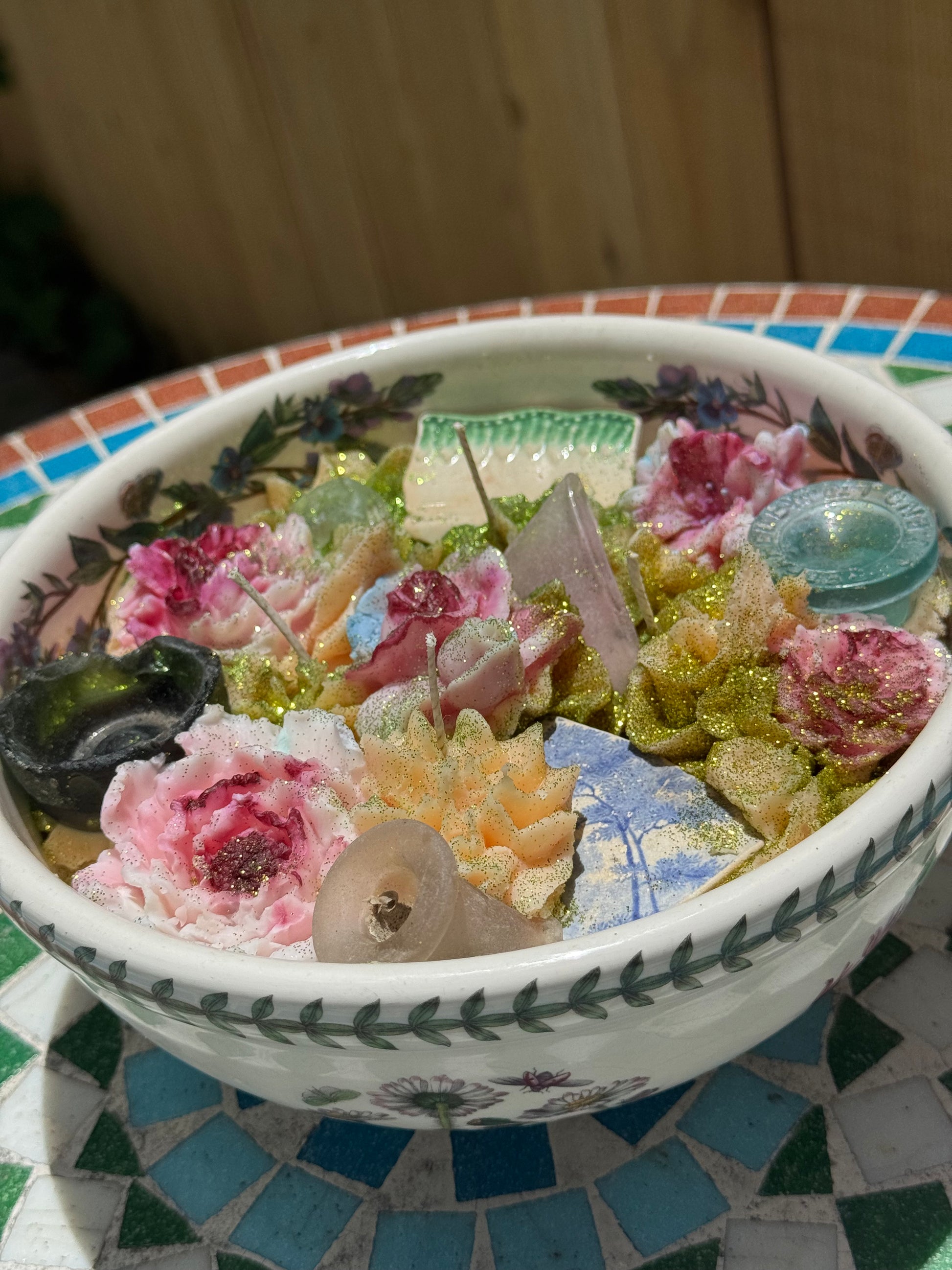 XL Candle- Extremely Sentimental Galveston Seaglass 1800s Pottery, Mermaid Nipple, Jug Stopper, Purple Glass- Peach Mojito